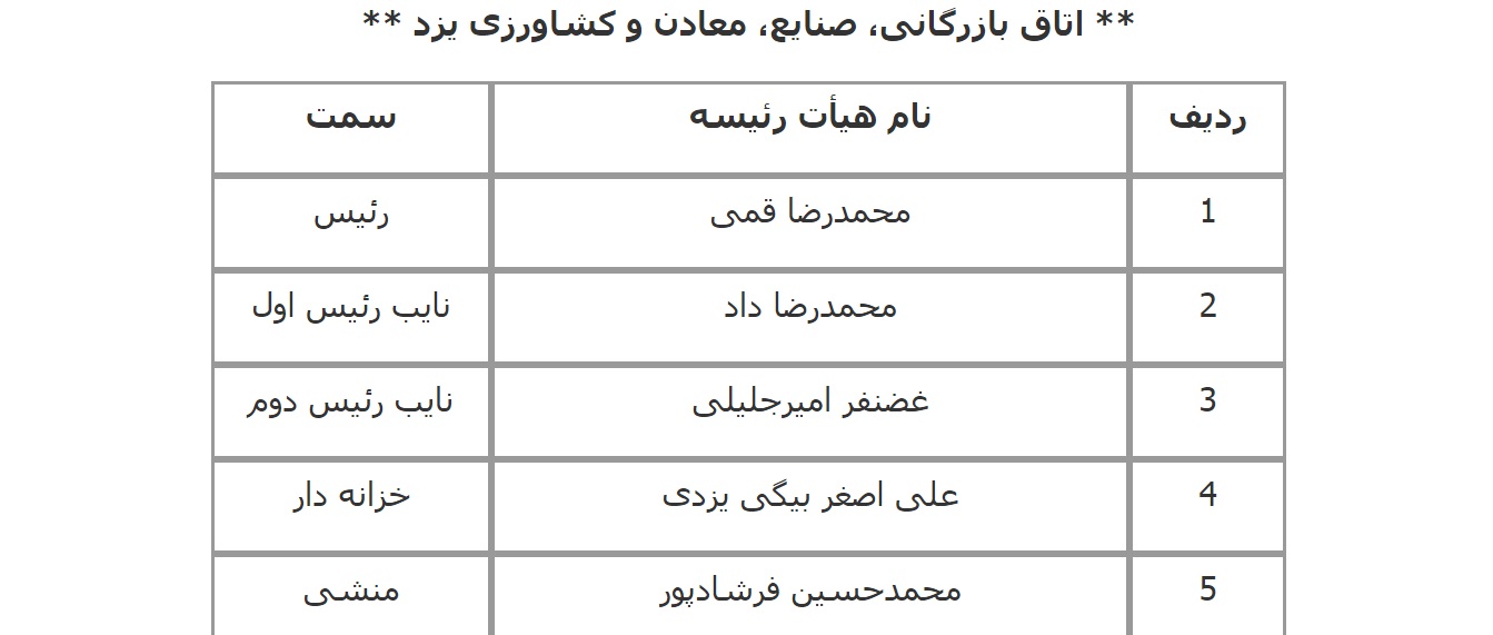 فهرست اعضای هیات رئیسه اتاق‌های سراسر کشور اعلام شده از سوی معاونت استان‌های اتاق بازرگانی، صنایع، معادن و کشاورزی ایران به شرح زیر است: