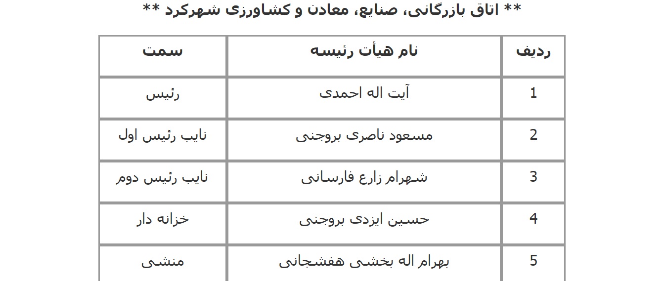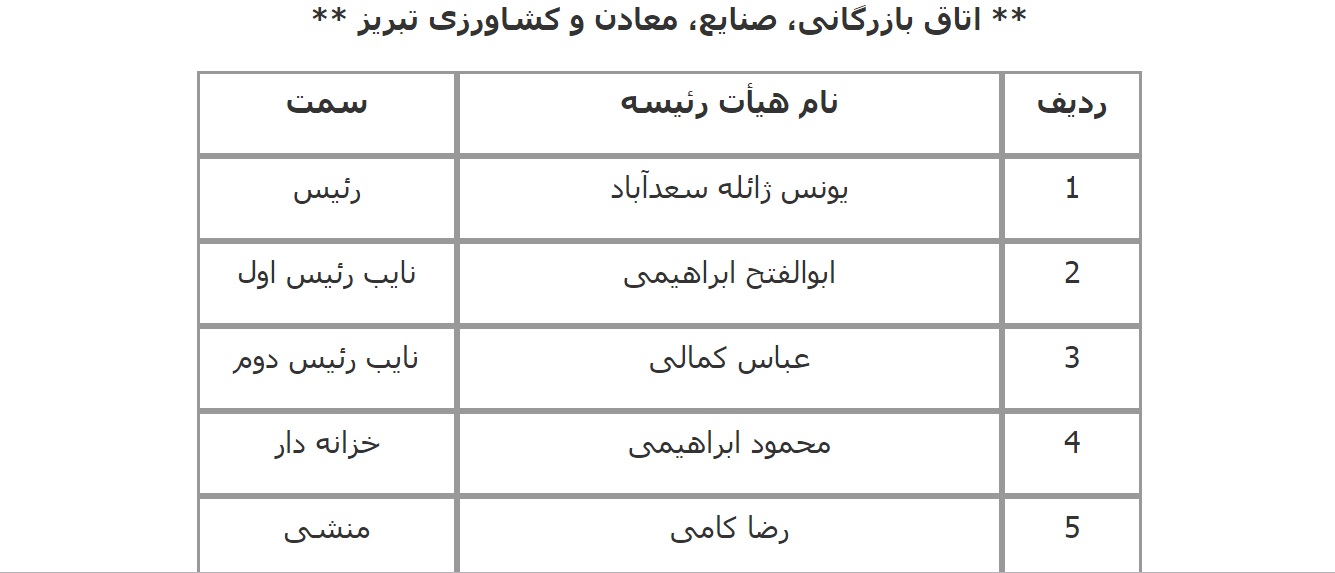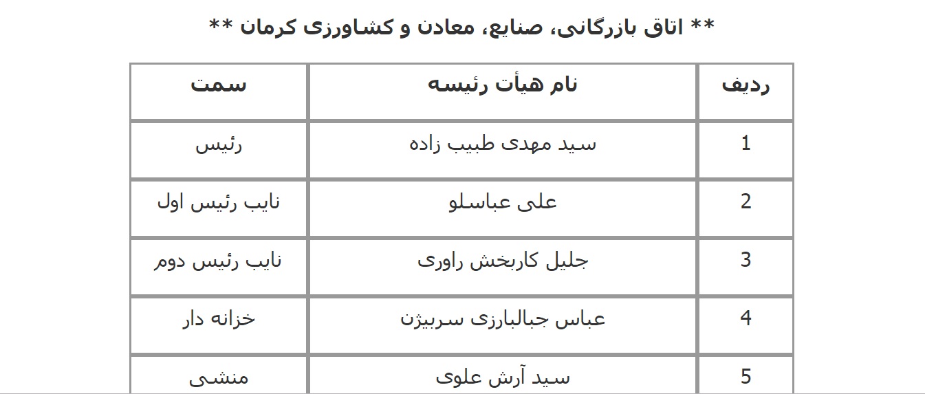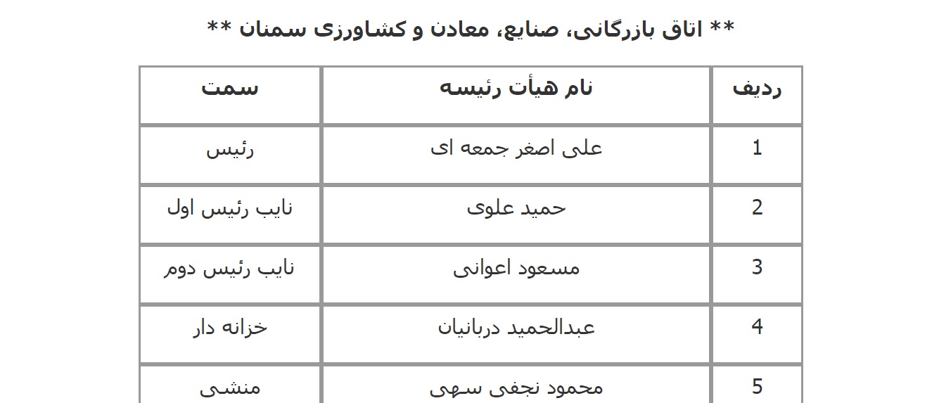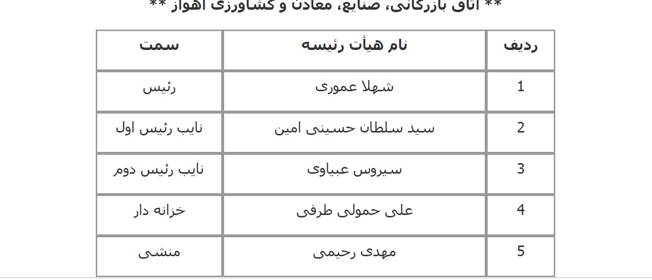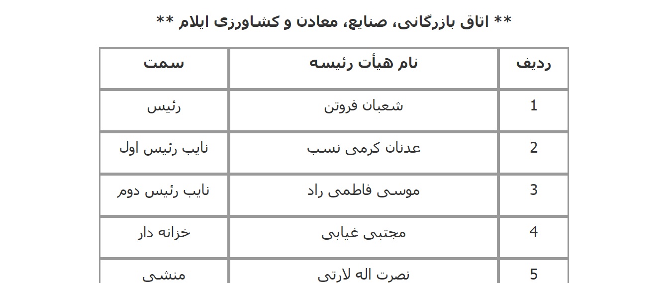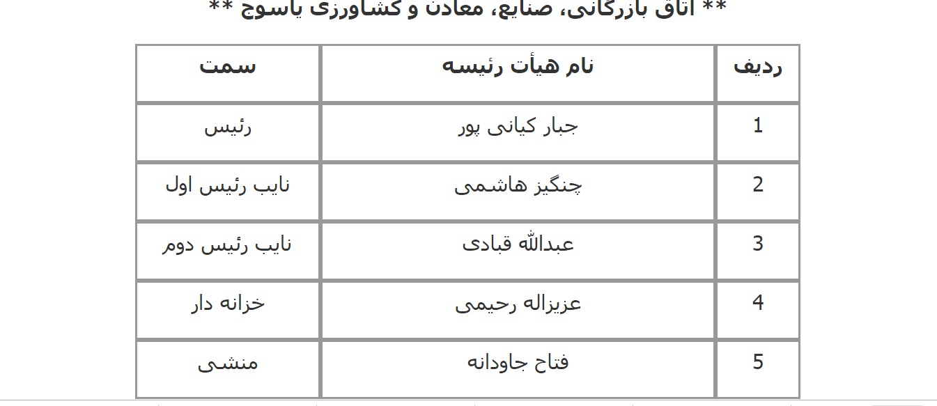 فهرست اعضای هیات رئیسه اتاق‌های سراسر کشور اعلام شده از سوی معاونت استان‌های اتاق بازرگانی، صنایع، معادن و کشاورزی ایران به شرح زیر است: