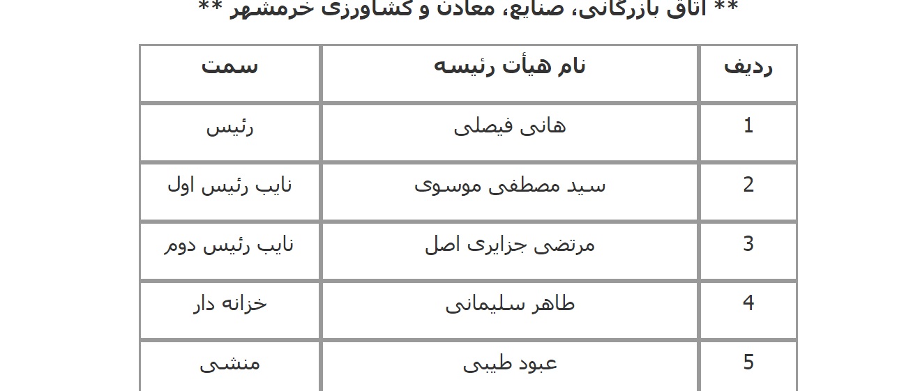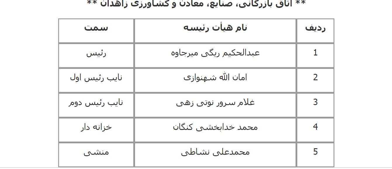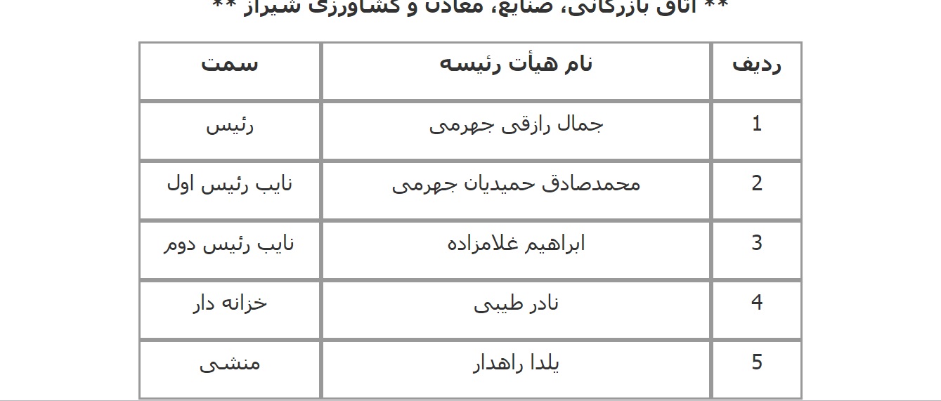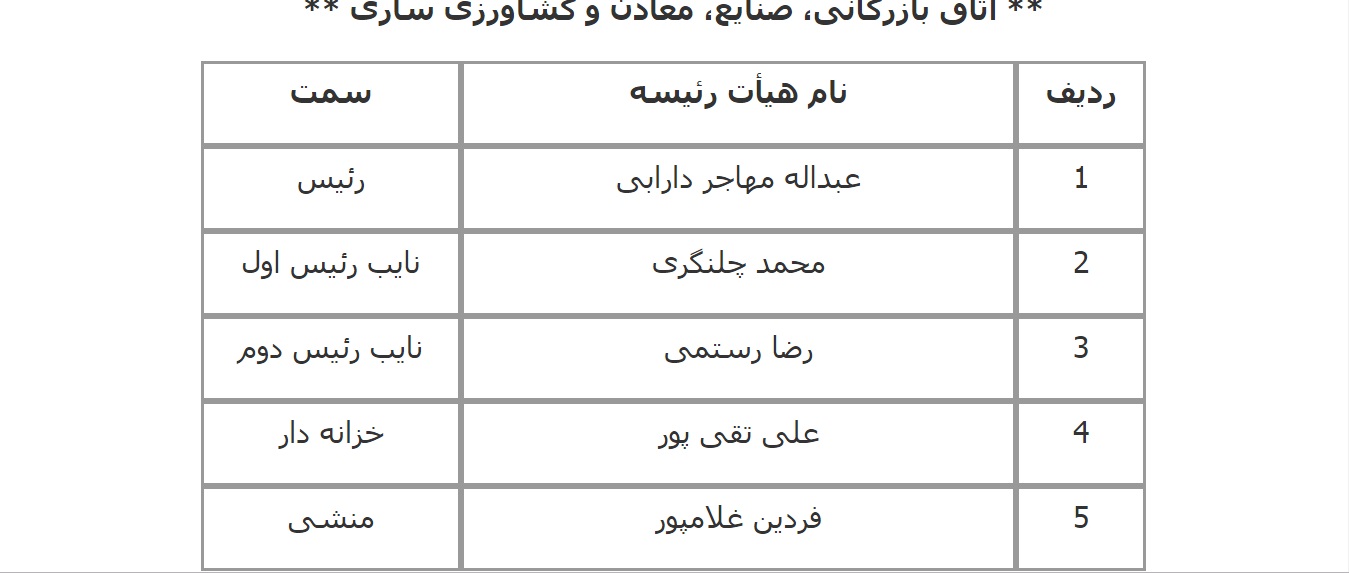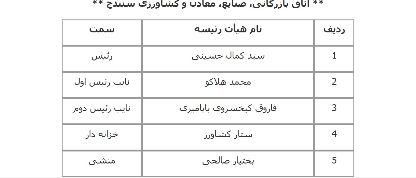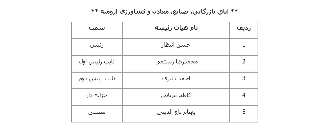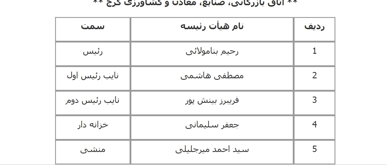 فهرست اعضای هیات رئیسه اتاق‌های سراسر کشور اعلام شده از سوی معاونت استان‌های اتاق بازرگانی، صنایع، معادن و کشاورزی ایران به شرح زیر است: