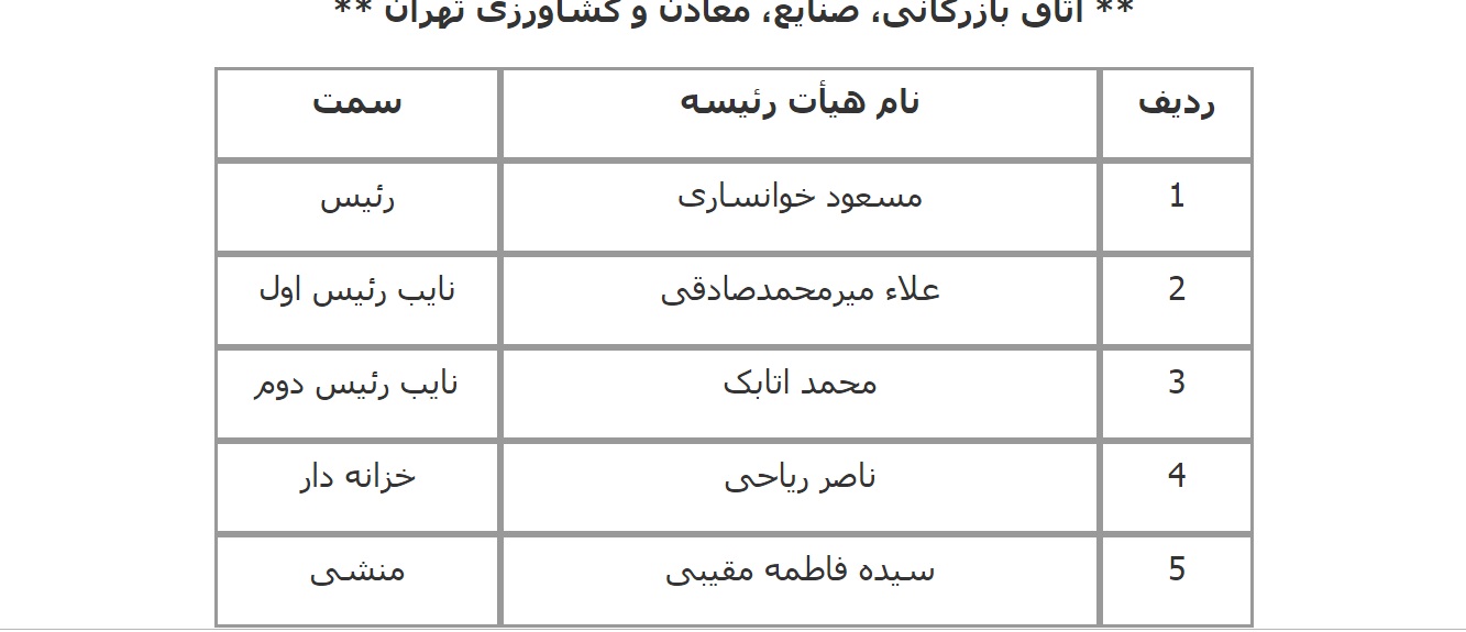 فهرست اعضای هیات رئیسه دوره نهم اتاق‌های سراسر کشور اعلام شد